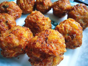 8、 大火油熱后,復炸一次,盛焦黃色。(油炸肉丸即制作完成)