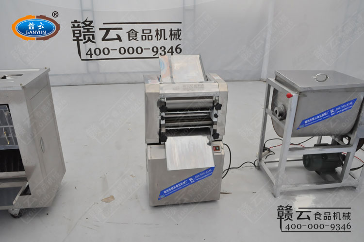 拍攝流程:先用和面機(jī)將25斤面粉和發(fā)酵粉充分?jǐn)嚢杈鶆蚝蠹尤胩撬兔,將和好的面放入立式壓面機(jī)壓2-3遍,后放入圓形饅頭成型機(jī)制作饅頭,一斤干面粉即可成型16個(gè)圓形饅頭;后補(bǔ)拍立式壓面機(jī)制作面條視頻。