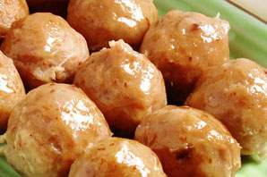 4、貢丸的成型:普遍的貢丸制作都是采用挖式貢丸成型機成型,半開明舀勺模擬手工舀丸子成型貢丸,這種貢丸成型機成型出來的貢丸圓度更好,所用模具也比普通的肉丸要大一些,是專門用于成型貢丸的,如贛云牌的170型貢丸成型機就是采用半開明舀勺成型貢丸。