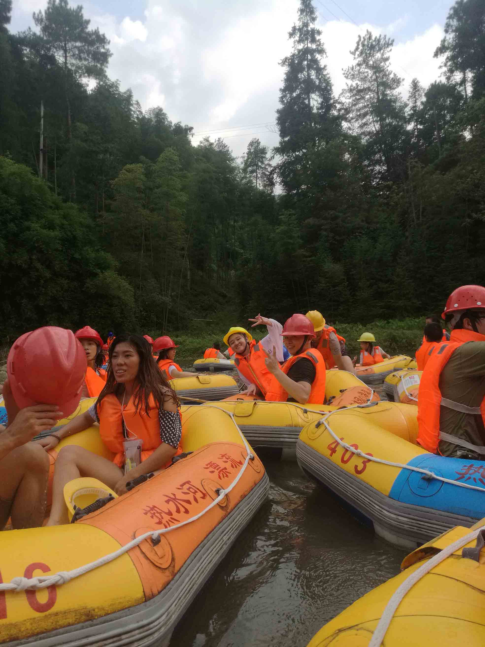 中午,大家集合聚餐。在農(nóng)家的院子里,體驗(yàn)鄉(xiāng)村的生活,大家互相交流情感。吃了農(nóng)家菜之后,便開始走上了漂流之旅,此次漂流的地點(diǎn)是在湖南汝城熱水河漂流,兩岸青山依依,竹海呢喃,自然形成的青石河,小橋、古樹、田野、村莊,無限風(fēng)光。大家駕駛著雙人座特制橡皮艇,穿峽谷、越險(xiǎn)灘,時(shí)兒急流激蕩,時(shí)兒緩流輕越,迎面而來的是一種其樂無窮的驚、險(xiǎn)、奇。在比較平緩的水灘上大家在享受優(yōu)美自然景色,打水仗等,同時(shí),也不忘留影紀(jì)念,這次旅游不但營造了和諧融洽的集體氣氛,而且增進(jìn)了彼此的情感。